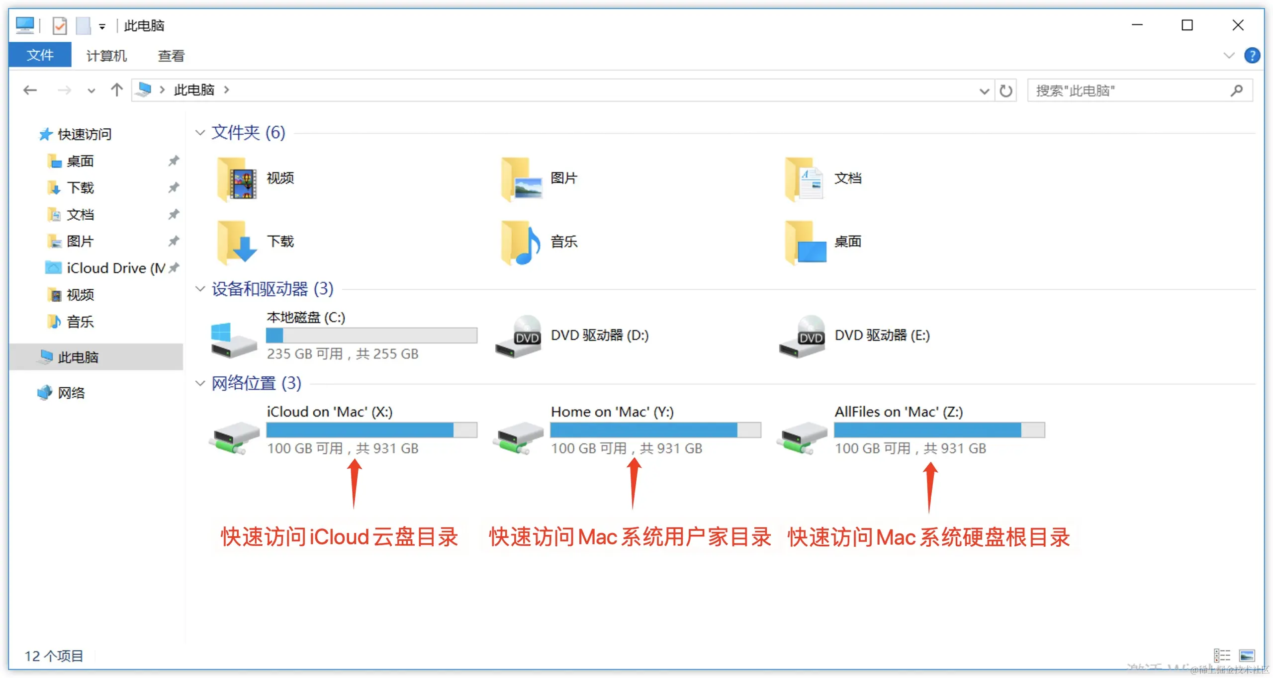 打开此电脑,即可看到Mac系统的常用目录,并且由于都有相应的盘符,直接把常用目录发送到桌面快捷也是可以的!