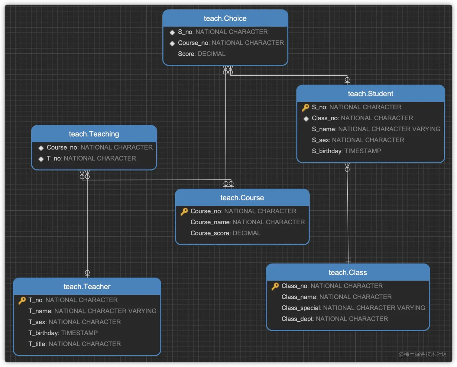 - 多对多:根据一个实例,能够找到多个对应实例,反过来亦然(如:一个学生 -> 选多门课,一门课 -> 被多人选)