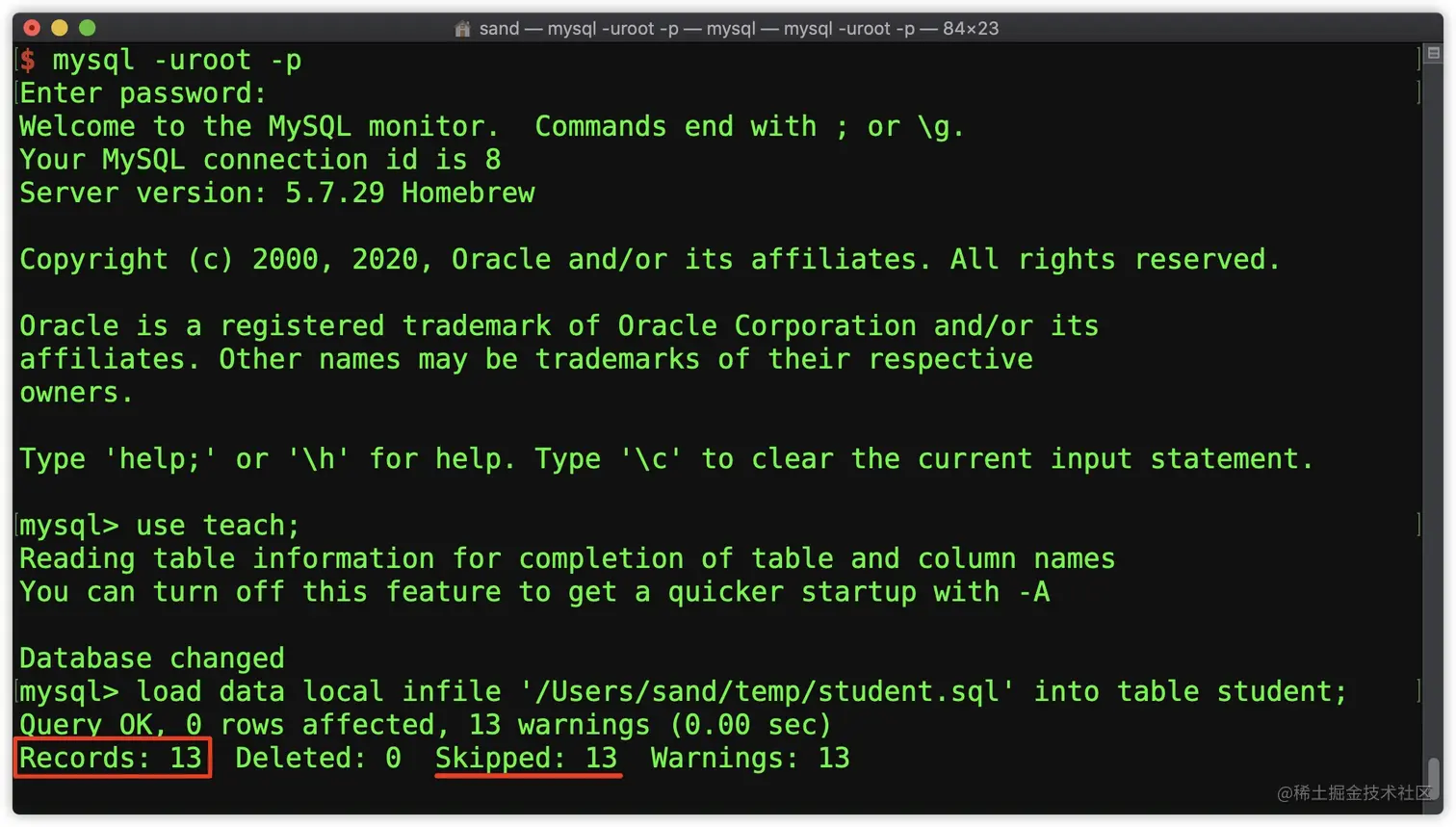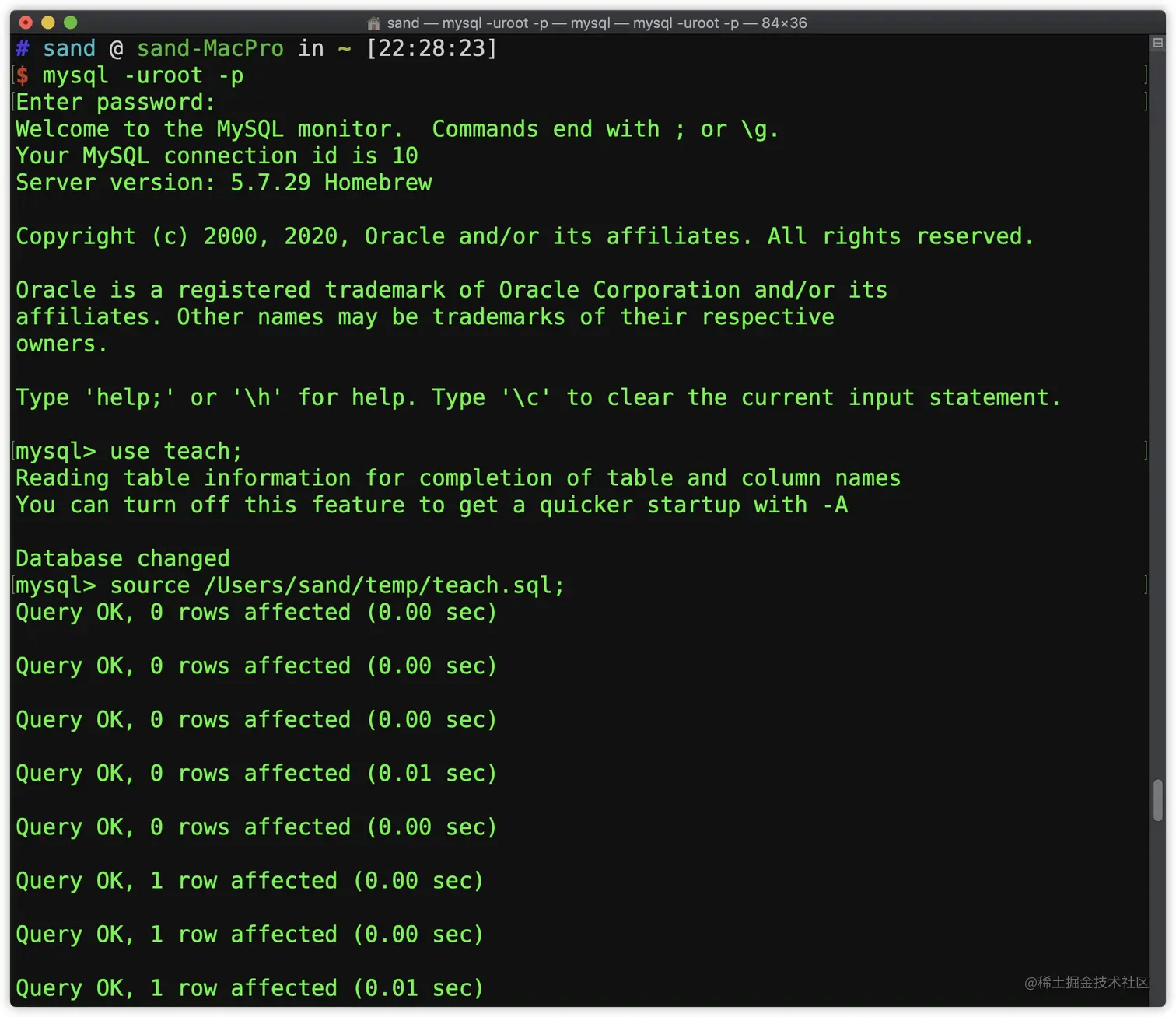加载sql文件后会显示每条SQL语句的执行结果,其中Query OK代表成功,rows affected代表当前语句对数据库的影响行数(0 rows affected对应建表语句和各种指令,只要显示Query OK就证明执行成功)。