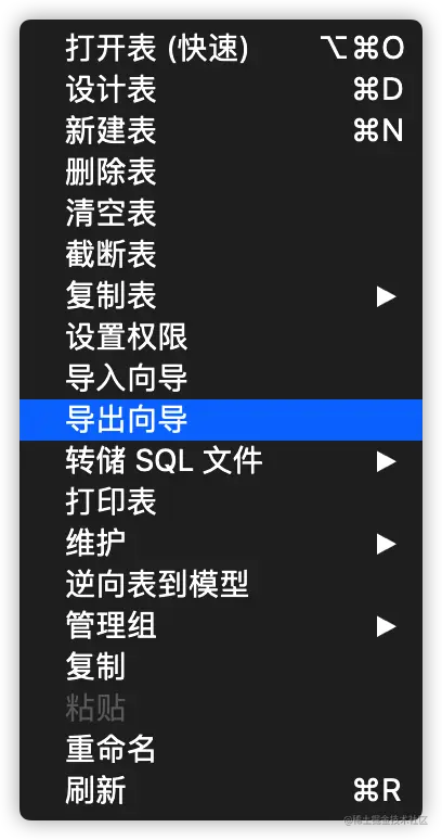 使用界面化工具来进行数据导出十分简单,以Navicat为例。选择某一个数据表,右键点击:导出向导。