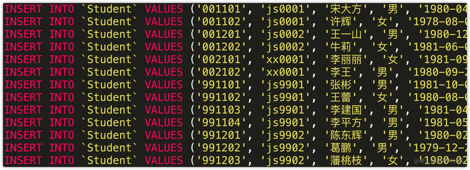 通过这种方式导出的sql文件只包含数据,并不包含表结构,如下: