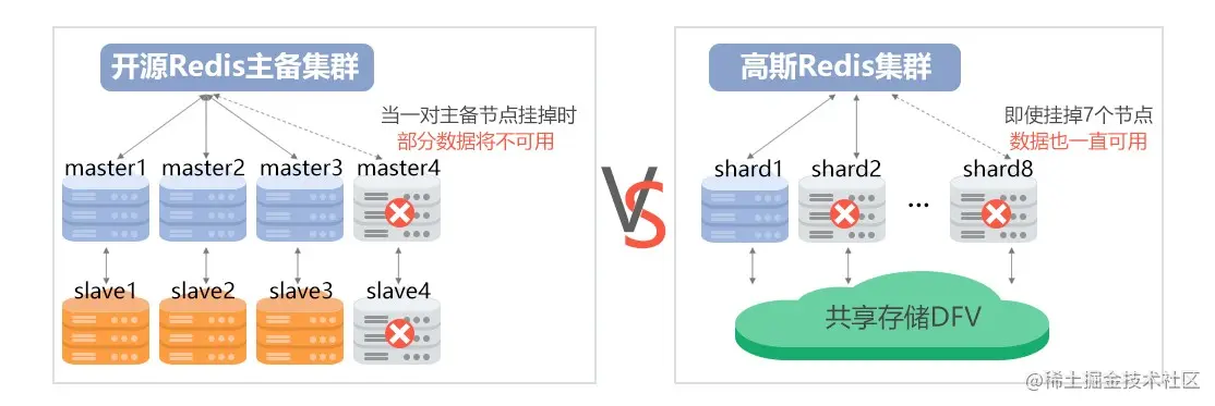开源Redis或友商Redis不管单分片还是集群,其数据复制都采用主从架构,导致N个节点的集群,如果同时挂掉一对主从(即2个节点),整个集群就不可用。而高斯Redis采用存算分离之后,每个计算节点都可以看到并共享所有数据,因此N个节点,最多可以容忍挂掉N-1个节点,真正做到比高可用还高的可用性。