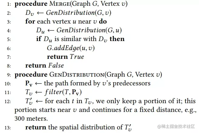 Merge操作具体实现如图6所示。对于一个要合并的顶点v,我们计算经过v的路径的轨迹未来的分布,然后我们找到v周围的顶点u,如果经过u的路径的轨迹未来分布和v的一致,我们加入路段(u,v),并返回True;如果v的分布与周围顶点都不同,则返回False。