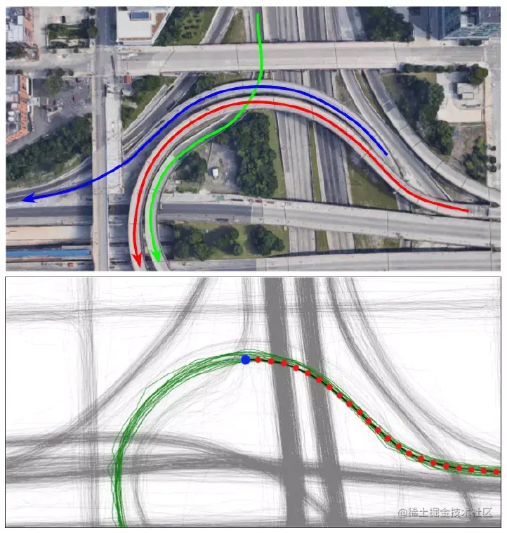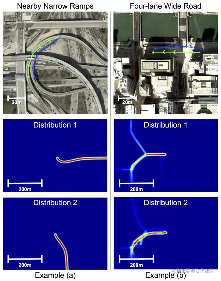 当我们生成一条路段后,需要将它和已有路网合并。但是这并不容易,合并的过程中,需要确保上下关系,平行关系以及多层级关系等等。为了克服这些挑战,本文只有在通过路段的轨迹未来的分布匹配的情况下,才会合并两个路段。图5中,我们展示了经过蓝色和绿色的路径的轨迹未来的分布情况。我们可以很明显发现,在例子(a)中两者的分布并不一致,但是在例子(b)中两者的分布几乎一样。