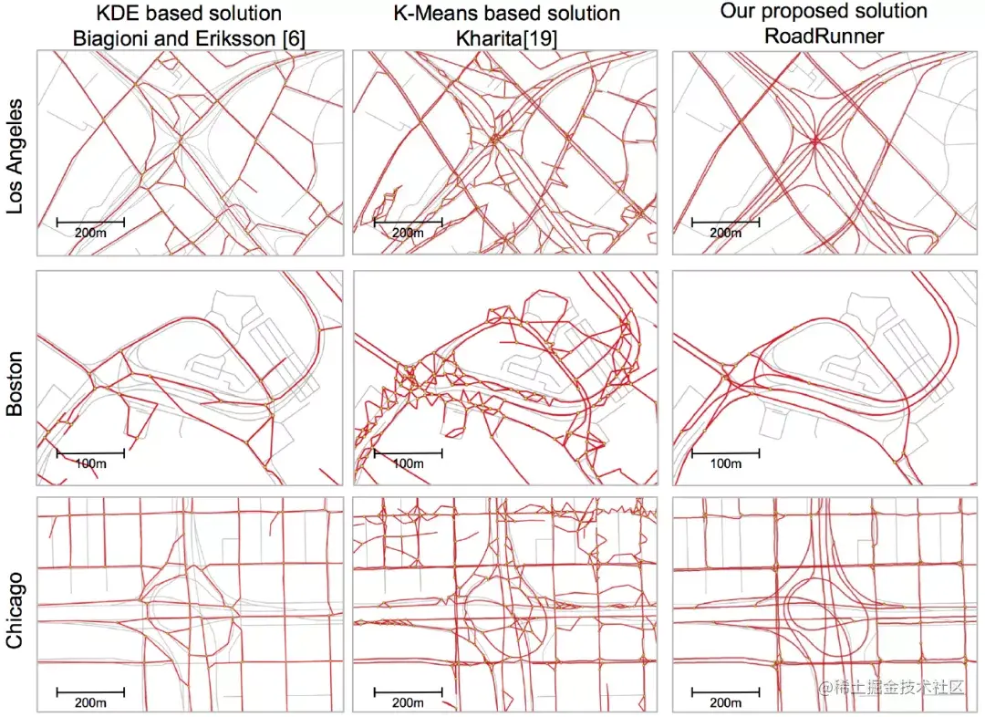 从轨迹中推测路网是一个非常有挑战的问题。图1左侧两栏给出了基于概率密度估计(KDE)和k-Means聚类的两类传统算法在三个城市(洛杉矶、波士顿、芝加哥)上的表现。生成的地图有三个问题: