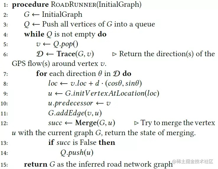 RoadRunner的算法流程如图2所示。算法的输入是一个初始的路网,可以来自于现有路网或者用别的方法推测得到的路网。我们先把初始路网中所有的顶点加入队列Q,队列中的顶点称为active顶点(第2-3行)。在每一轮迭代中,RoadRunner从队列中挑选一个active顶点v,通过Trace操作提取轨迹在顶点v处的流出方向(第5-6行)。对于每个流出方向θ,我们加入一条从v出发,方向为θ,距离为固定长度d的小路段来扩展当前路网(第7-11行)。然后通过Merge操作,尝试将该小路段的另一个顶点u合并到现有路网。如果合并失败,我们将u加入Q用于下一轮迭代(第12-14行)。当Q为空时,算法停止,并返回当前路网。
