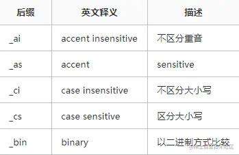 1.Collation: 比较规则名称,基本符合字符集名称_语言_后缀模式。第一部分字符集名称就是与其关联的字符集的名称开头,第二部分表示该比较规则作用的语言,比如utf8_spanish_ci是以西班牙语的规则比较,utf8_general_ci是一种通用的比较规则。第三部分后缀主要用来表示要不要区分大小写和重音之类的。