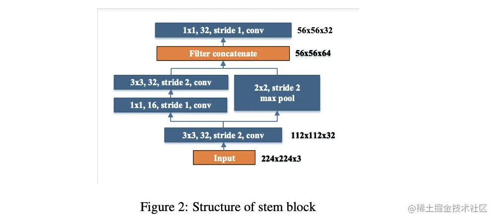 DenseNet使用stride=2的卷积对输入进行初步处理,受Inception-v4和DSOD启发,论文设计了一个高效的stem block,结构如图2所示,两条路径能提取不同的特征。这样可以在不带来过多计算耗时的前提下,提高网络的特征表达能力。