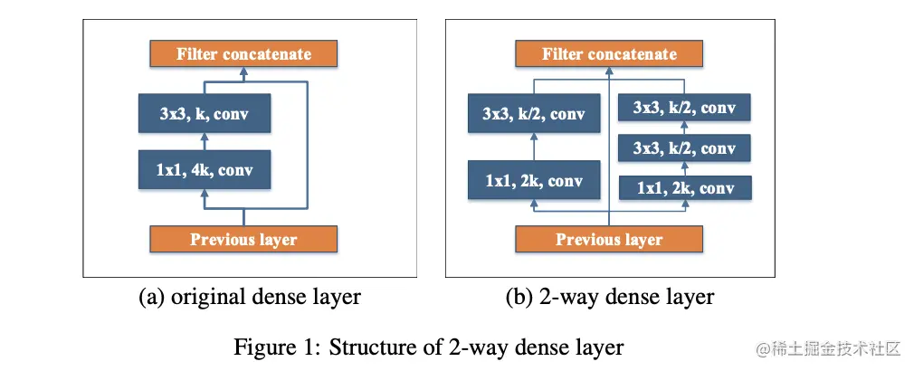 受GoogLeNet的启发,论文将原来的dense layer改为2-way dense layer,如图1b所示,新的路径叠加两个卷积来学习获取不同的感受域特征,特别是大物体特征。