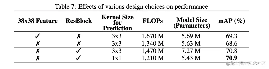 - Small Convolutional Kernel for Prediction,由于使用了ResBlock进行了特征的进一步提取,在预测部分可以使用卷积核加速,准确率与卷积差不多。