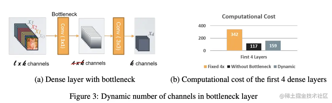 在DenseNet中,使用bottleneck layer进行输入特征的压缩,但是bottleneck layer的输出固定为dense layer输出的4倍。在网络的早些层中,会存在bottleneck layer的输出比输入更多的情况,导致效率下降。为此,论文将bottleneck layer的输出大小跟输入挂钩,保证不大于输入大小,从图4可以看出,修改后计算效率提升了一倍。