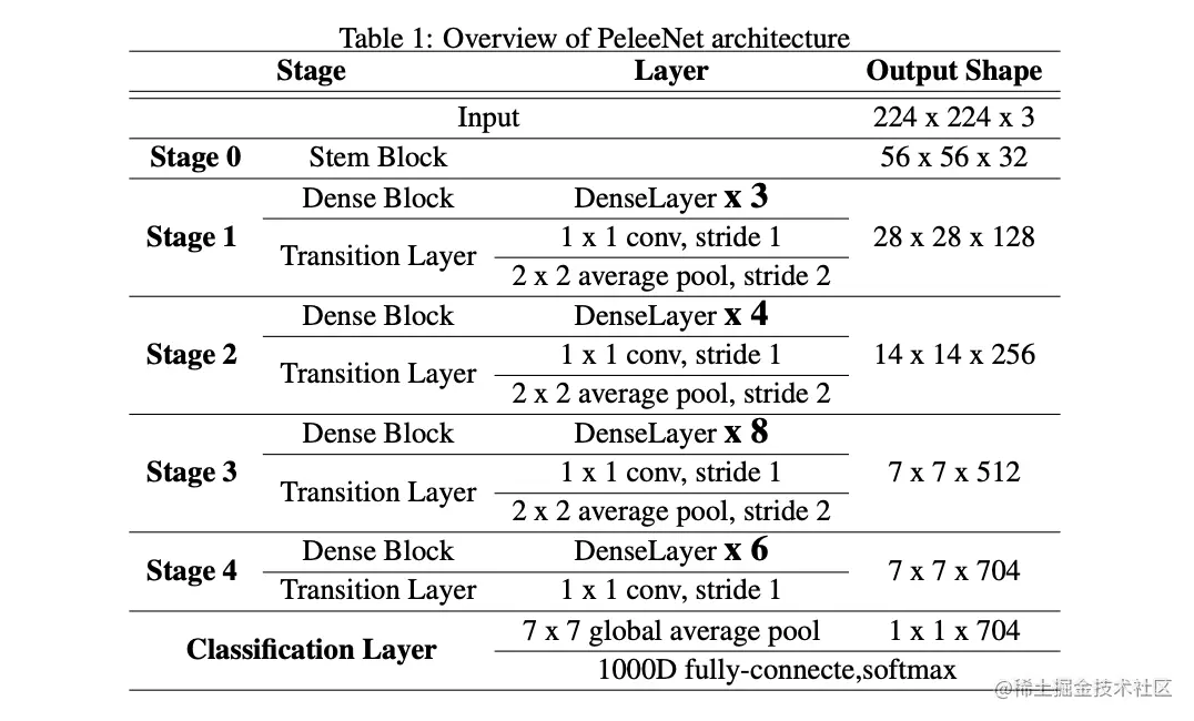 PeleeNet的结构如表1所示,包含一个stem block、4个特征提取阶段以及最后的stride为2的平均池化层。论文纠结使用3个特征提取阶段还是4个特征提取阶段,3个阶段需要stem block更多地缩减特征图大小,考虑到开头过快地减小特征图会大小会减弱网络的表达能力,最终仍采用4个阶段。