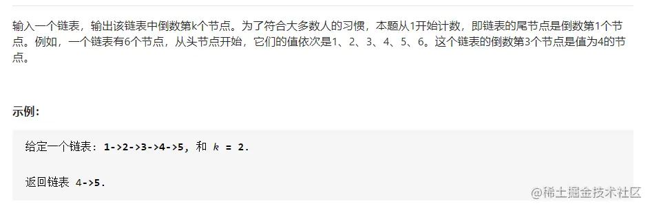 解题思路:遍历出链表长度,设置一个计数点,当找到倒数第K个节点时返回,链表(感觉走了笨办法)