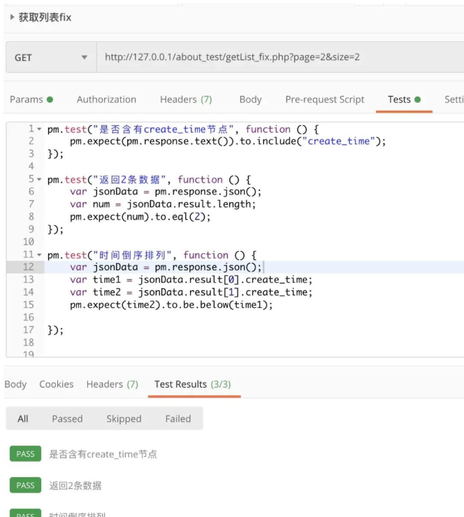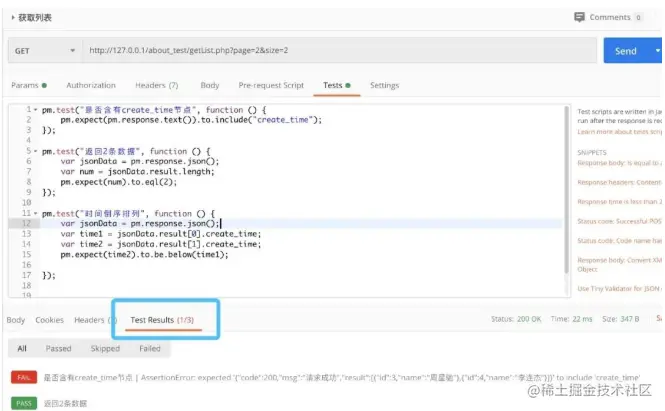1,'name'=>'成龙','create\_time'=>1587890857000), array('id'=>2,'name'=>'周润发','create\_time'=>1587804457000), array('id'=>3,'name'=>'周星驰','create\_time'=>1587690857000), array('id'=>4,'name'=>'李连杰','create\_time'=>1587590857000), array('id'=>5,'name'=>'梁朝伟','create\_time'=>1587490857000), array('id'=>6,'name'=>'张曼玉','create\_time'=>1587390857000), array('id'=>7,'name'=>'惠英红','create\_time'=>1587290857000), array('id'=>8,'name'=>'林青霞','create\_time'=>1587190857000), array('id'=>9,'name'=>'王祖贤','create\_time'=>1587090857000), array('id'=>10,'name'=>'巩俐','create\_time'=>1586890857000)); foreach( data\_list as datalistaskey=>$value){ if( key >= ( key>=(page -1) \* $size && $key < page \* page∗size){ temp\[\] = temp\[\]=value; } } // 组织的数据 $data = array( 'code' => 200, 'msg' => '请求成功', 'result' => $temp ); // [PHP](https://www.oschina.net/p/php)数组转json rst = json\_encode( rst=jsonencode(data,JSON\_UNESCAPED\_UNICODE); // 打印结果 echo $rst; 按照上面的流程,创建一个请求,添加断言,在此访问返回结果如下:  返回绿色说明测试通过。 文中的断言代码是由js编写,大家书写断言的时候不要被代码吓到,因为Postman已经提供了比较丰富的断言片段,直接点击即可生成。 愿你我相遇,皆有所获! 欢迎关注微信公众号:程序员一凡 1.免费领取一份216页软件测试工程师面试宝典文档资料。 2.软件测试学习路线以及相对应的视频学习教程免费分享!