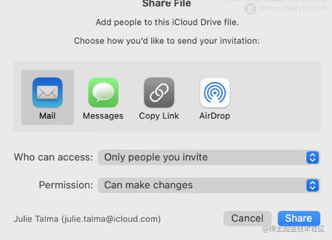 可以使用“邮件”、“信息”、“拷贝链接”和“隔空投送”来发送邀请。