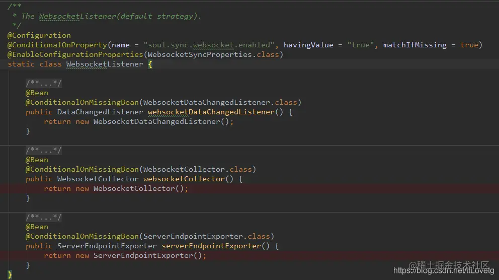 看这段源码的时候,我遇到最大的问题就是想不通 DataChangedEventDispatcher 类的 listeners 是什么时候赋值的,我加了很多断点,但编辑 selector的时候,就是进不到 afterPropertiesSet 方法里的断点。虽然我也找到了 DataSyncConfiguration 这个类,看到了上图的那些代码,但当时就是想不明白。后来也不知道怎么了,我突然想到了 @ConditionalOnProperty 这个注解的作用,这个条件成立,就会把这个 bean 注册进来,也搜了下 InitializingBean 这个接口,才意识到启动 soul-admin 的时候,就已经给 listeners 赋值了。