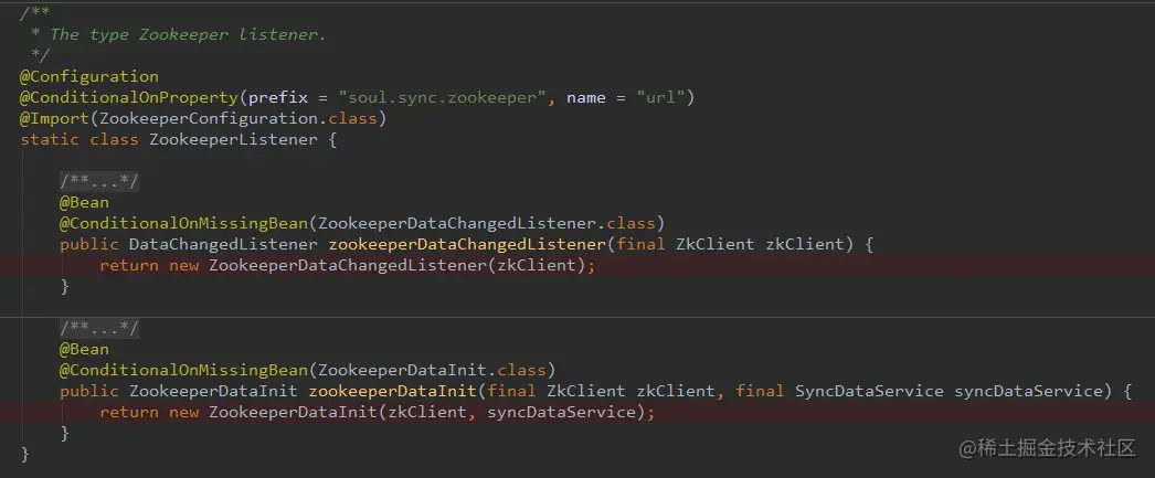 soul-bootstrap 启动时,会去加载类 ZookeeperSyncDataConfiguration ,它会新建一个 ZookeeperSyncDataService 实例。