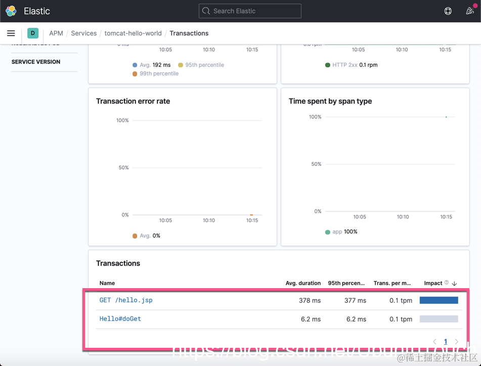 我们可以看到在 sample 应用中的两个接口的 transaction。点击上面的 “GET /hello.jsp” 接口: