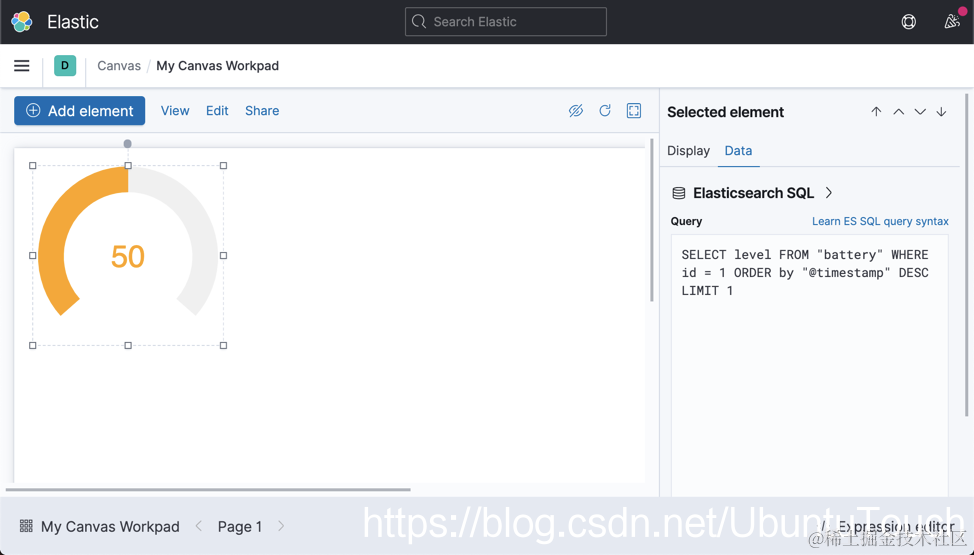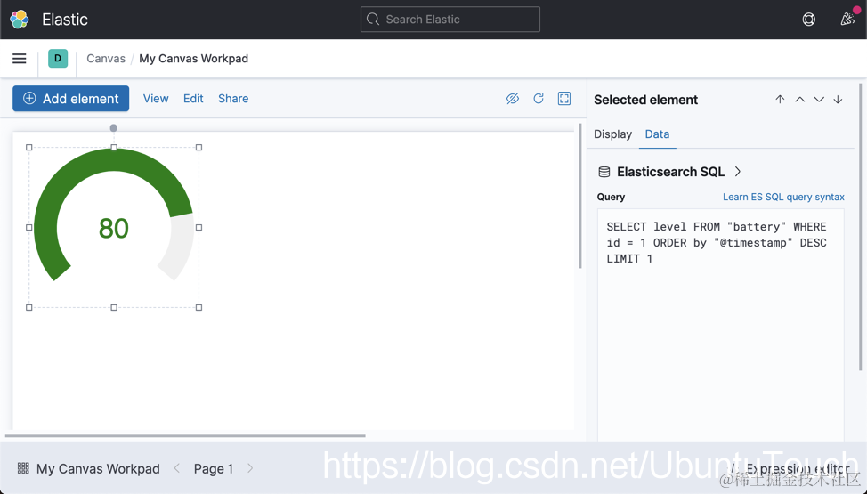 在上面,我们从 battery 索引中获取数据。请注意上面的 query 语句。它获取 battery 索引中的最近一条数据来做展示。当 level 大于 66 时,显示 green;当 level 大于 33 而小于 66 时,显示 orange 颜色;当 level 为其它的值时,显示为红色。