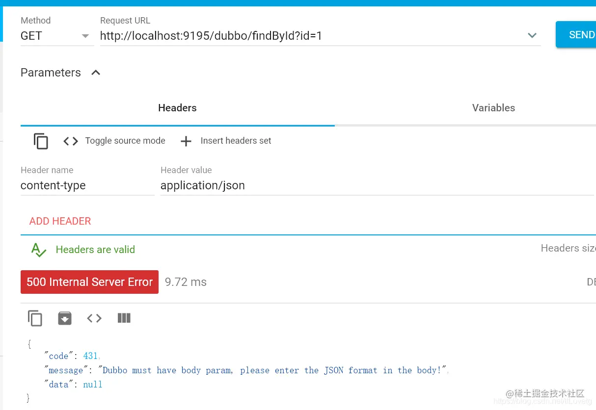 访问网关代理的 dubbo 时,发现 get ,post 都可以,一开始使用 get 时,还遇到一个问题,如下图