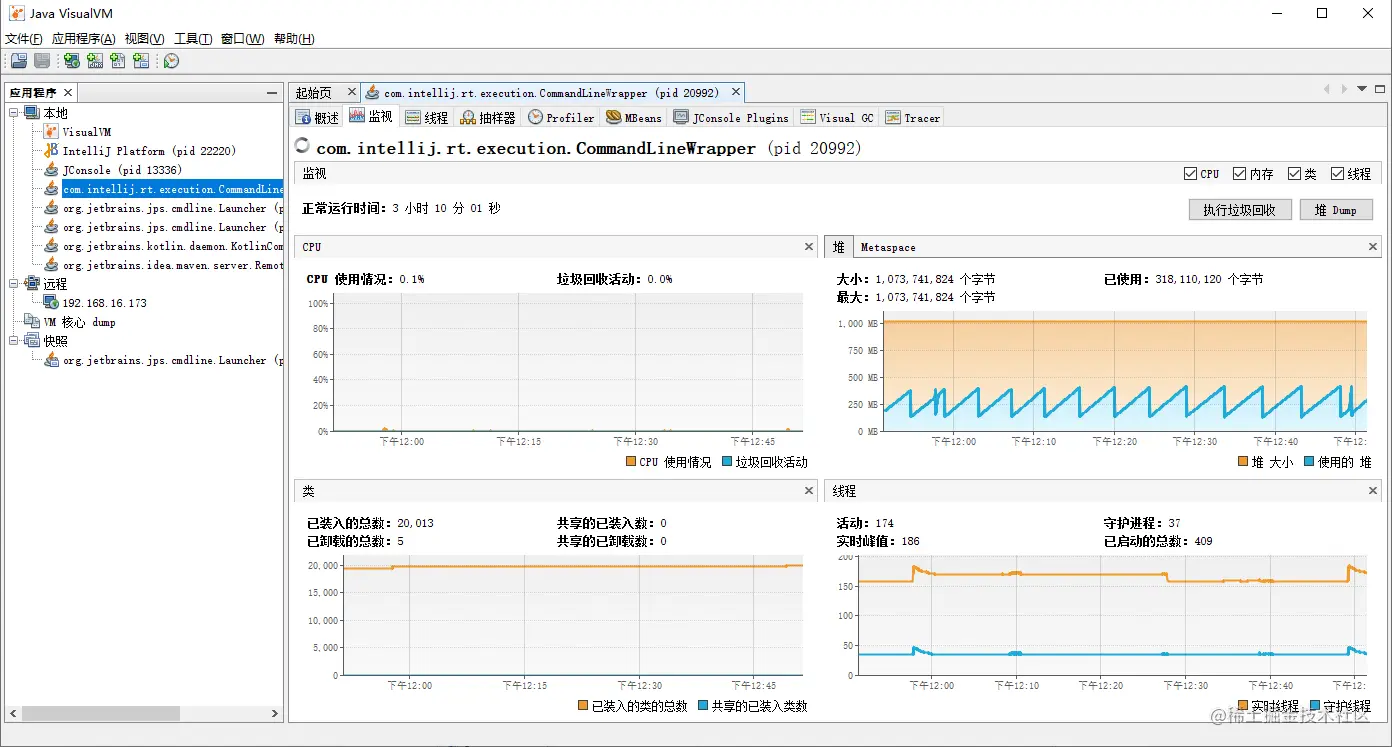 在左边选择需要监控的程序,右边就可以可查看CPU、堆、线程等波动情况,也可以直接在这里进行手动 GC 和堆 Dump 操作。