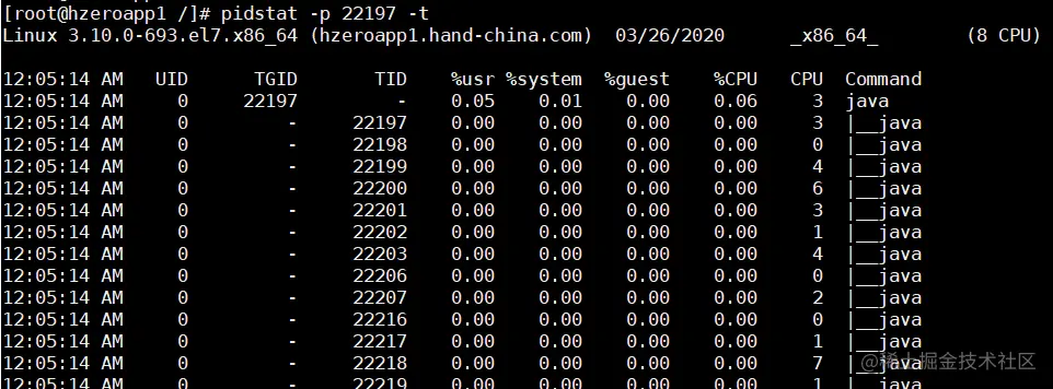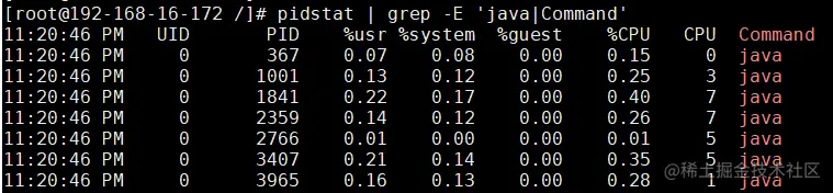 PID:进程ID%usr:进程在用户空间占用cpu的百分比%system:进程在内核空间占用cpu的百分比%guest:进程在虚拟机占用cpu的百分比%CPU:进程占用cpu的百分比CPU:处理进程的cpu编号Command:当前进程对应的命令