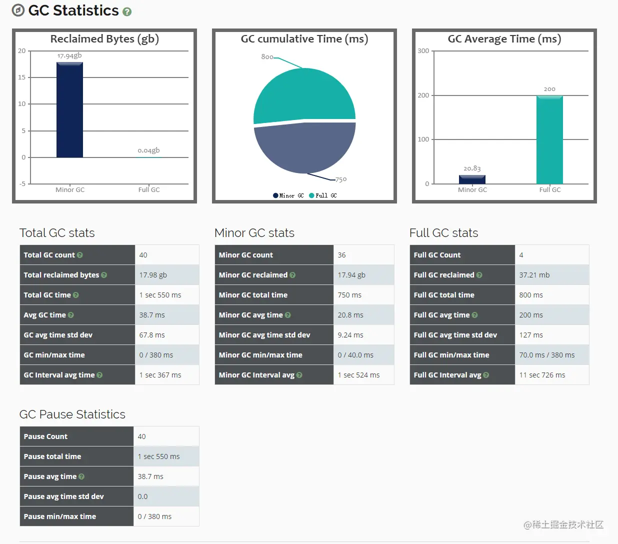 然后通过 File 打开GC日志文件,就可以看到GC统计图和GC情况。通过工具,我们可以看到吞吐量、停顿时间以及 GC 的频率等信息,从而可以非常直观地了解到 GC 的性能情况。