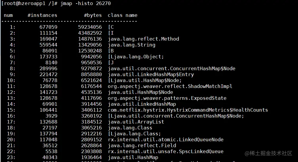 这个命令会按照各种对象占用内存空间的大小降序排列,把占用内存最多的对象放在最上面。通过这个命令可以简单的了解下当前jvm中的对象对内存占用的情况以及当前内存里到底是哪个对象占用了大量的内存空间。