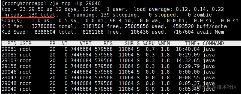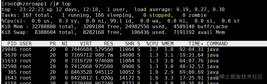 23:22:23:指的是当前时间up 12 days, 12:18:指的是机器已经运行了多长时间1 user:当前机器有一个用户在使用load average: 0.19, 0.27, 0.30:指 CPU 在1分钟、5分钟、15分钟内的负载情况。