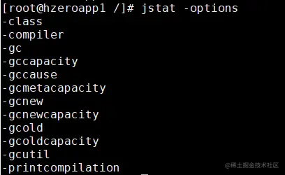 -class:显示 ClassLoad 的相关信息;-compiler:显示 JIT 编译的相关信息;-gc:显示和 gc 相关的堆信息;-gccapacity:显示各个代的容量以及使用情况;-gcmetacapacity:显示 Metaspace 的大小;-gcnew:显示新生代信息;-gcnewcapacity:显示新生代大小和使用情况;-gcold:显示老年代和永久代的信息;-gcoldcapacity:显示老年代的大小;-gcutil:显示垃圾收集信息;-gccause:显示垃圾回收的相关信息(同 -gcutil),同时显示最后一次或当前正在发生的垃圾回收的诱因;-printcompilation:输出 JIT 编译的方法信息