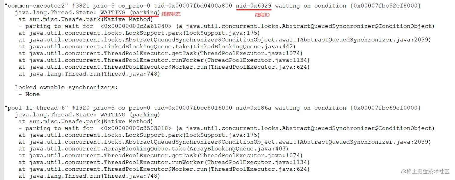 pool-11-thread-6:线程名称#1920:线程编号prio=5:线程的优先级别os_prio=0:系统级别的线程优先级tid=0x00007f87e028c000:线程IDnid=0x6724:native 线程的id,通过printf "%x\n" <pid>命令转换线程IDwaiting on condition [0x00007f87b97d2000]:线程当前的状态