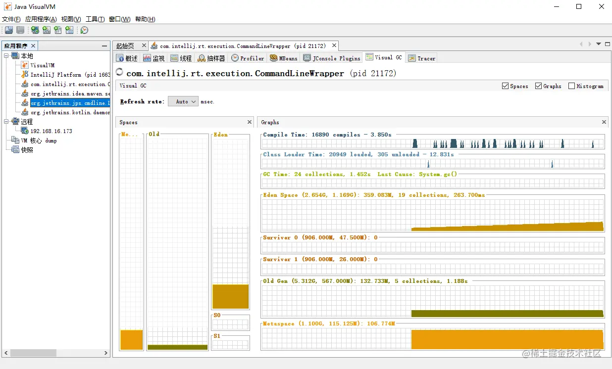 VisualVM 提供了一个可视界面,用于查看JVM上运行的基于 Java 技术的应用程序的详细信息。VisualVM 能够监控线程,内存情况,方法的CPU时间和内存中的对象,已被GC的对象,反向查看分配的堆栈(如100个String对象分别由哪几个对象分配出来的)等。