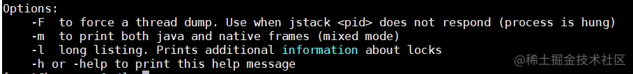 -l:长列表. 打印关于锁的附加信息,例如属于java.util.concurrent的ownable synchronizers列表。-F:当jstack [-l] pid没有响应的时候强制打印栈信息-m:打印 java 和native c/c++框架的所有栈信息.-h | -help:打印帮助信息