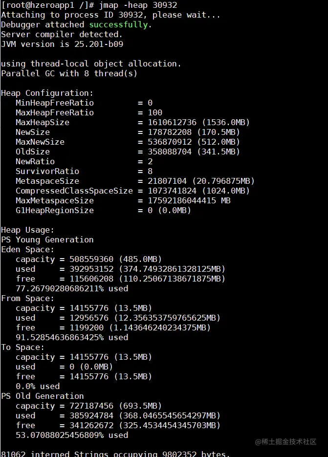这个命令会打印出堆内存相关的一些参数设置以及各个区域的情况,要查看这些信息一般使用 jstat 命令就足够了。