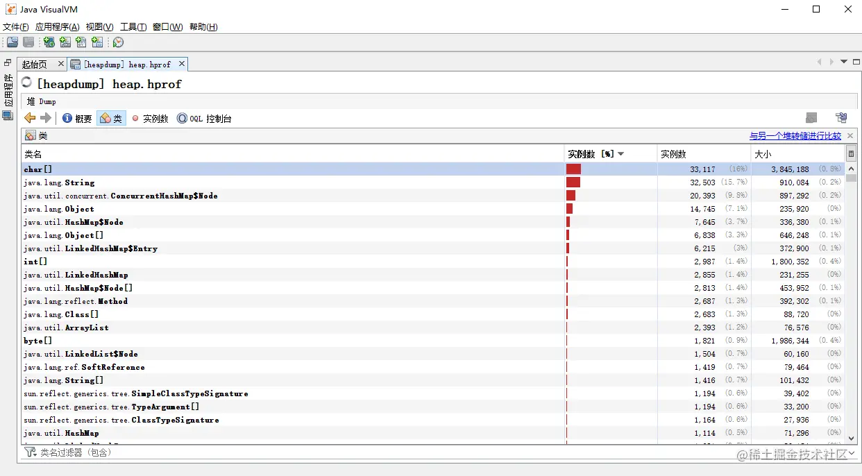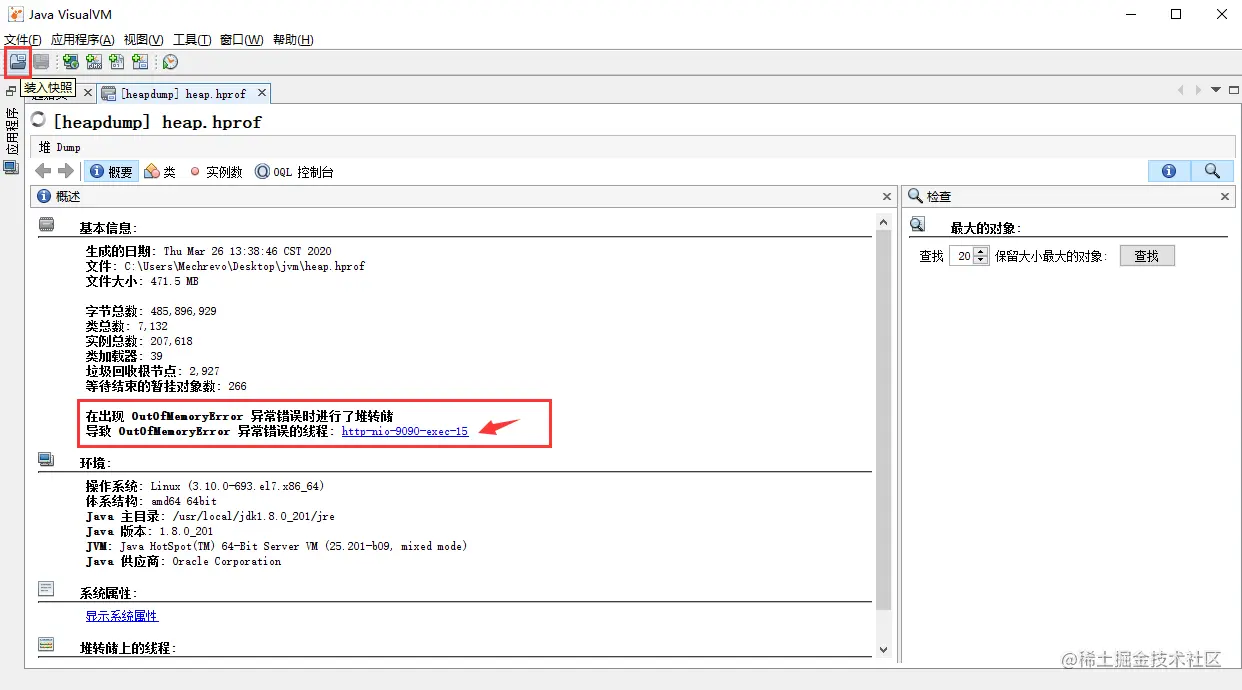 通过左上角装入快照按钮打开 dump 的堆转储文件,就可以分析堆转储快照了。
