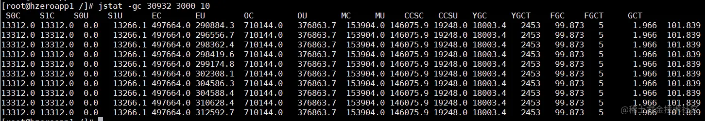 S0:Survivor0 区占用百分比S1:Survivor1 区占用百分比E:Eden 区占用百分比O:老年代占用百分比M:元数据区占用百分比YGC:年轻代回收次数YGCT:年轻代回收耗时FGC:老年代回收次数FGCT:老年代回收耗时GCT:GC总耗时