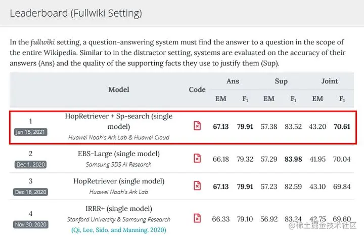 HotpotQA评测(Fullwiki Setting赛道)最新榜单(截至2021年1月20日)