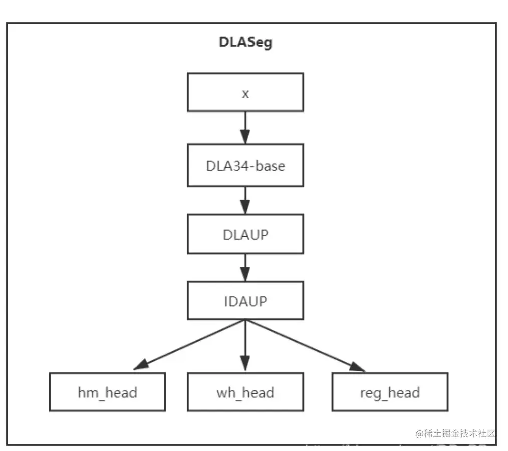 回到DLASeg,共包括上面的DLA,DLAUp,IDAUp,以及三个head。示意图如下所示。