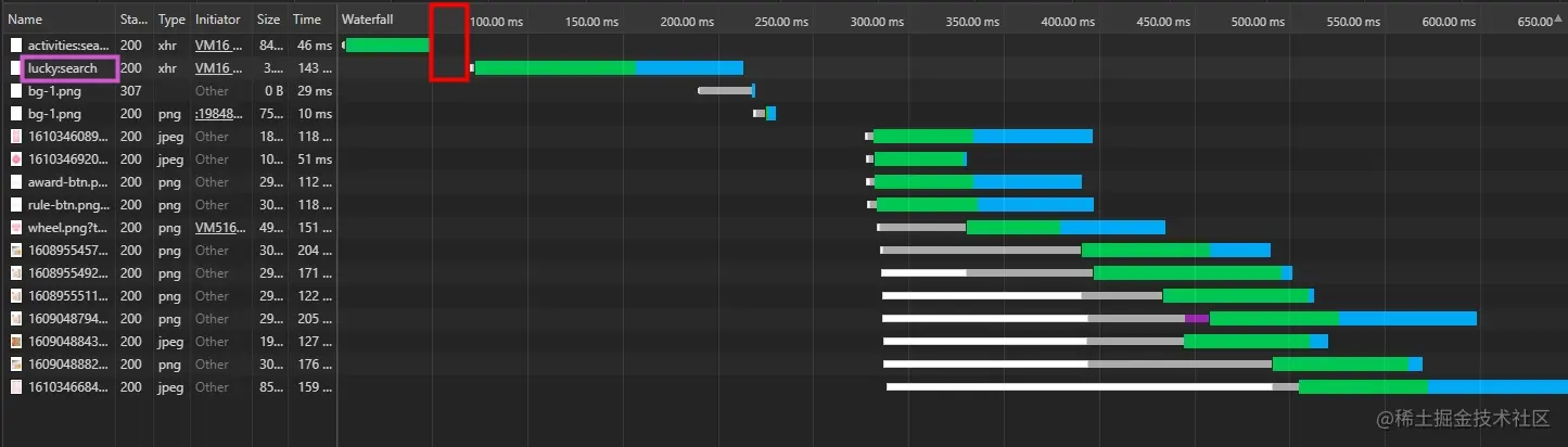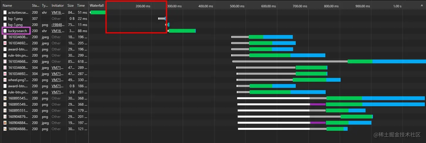 两者红色框的宽度差,表示的是提前了多少时间去请求接口数据,大概在100ms左右。因为下面的静态资源地址来自于接口的数据,相当于减少了堵塞后面资源加载100ms左右。