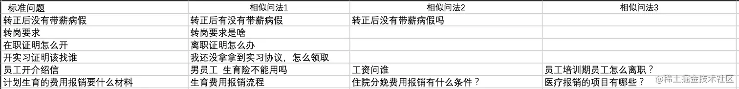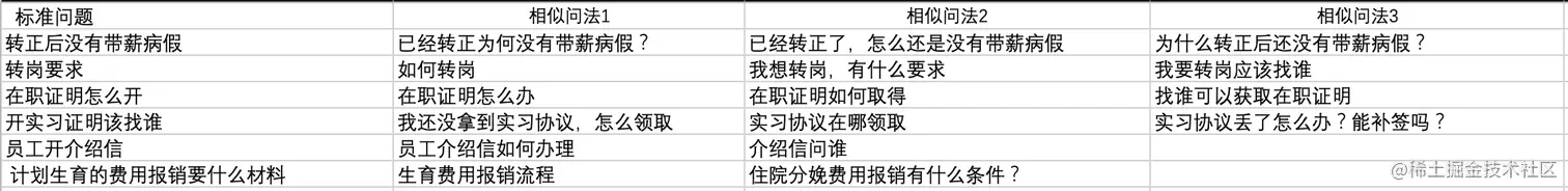 客服机器人的核心任务是有效回答用户各式各样的问题。而回答问题需要知识,通常客服系统所使用的知识的表现形式是问题-答案对(Question-Answer Pair),这些信息通常由了解实际业务场景的同学整理而成,在客服系统里,这些问题-答案对的集合通常被命名为知识库,下面的例子是人力资源共享服务中心场景(HRSSC)下典型知识库的一个片段。