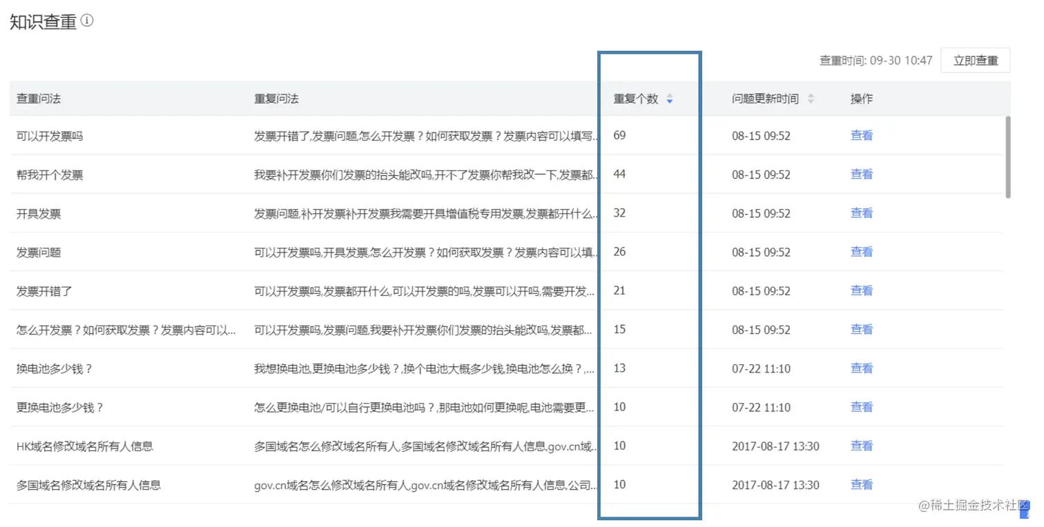 可以看到知识查重功能检测出大量相似问法分布在不同的知识点下面的情况,提示需要对知识库进行整理。