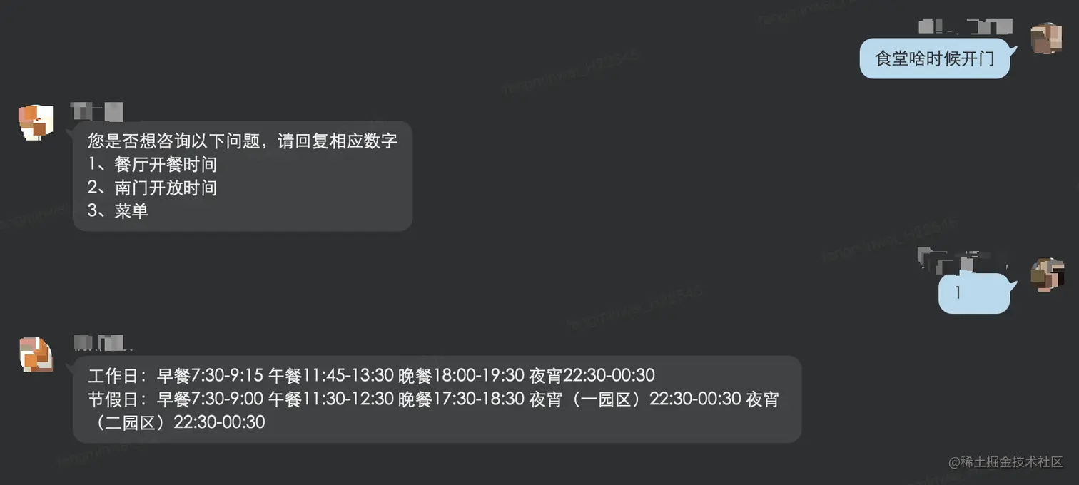 下图是一个“猜你想问”范例,用户提问“食堂啥时候开门”,系统的知识库里并没有很接近的知识点,但是算法找到了三个比较接近的知识点,作为“猜你想问”候选提交给用户。如果用户做出了选择,比如示例里面的“1”, 那么,用户选中的问题 “餐厅开餐时间”和之前用户输入的问法“食堂啥时候开门”会在后台被保留下来。之后运营同学可以决定是否需要把“食堂啥时候开门”加入“餐厅开餐时间”所在的知识点里面。