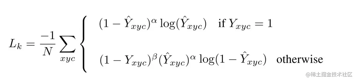 其中hm head输出为, 其中80为类别数。代表对于类别c,中心点在(x,y)上出现的概率。这里基于focal loss进行改进: