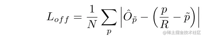 - 其中reg head输出为,预测的偏差为$O'_{p'}。偏差的GT为[float(GT坐标下采样R倍)-int(GT坐标下采样R倍)]。 用L1 loss约束: