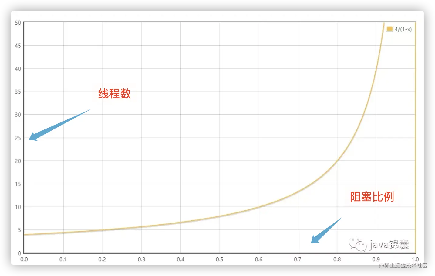 当阻塞比例为0,也就是纯计算任务,线程数等于核心数(这里是4);阻塞比例越大,线程池的线程数应该更多。