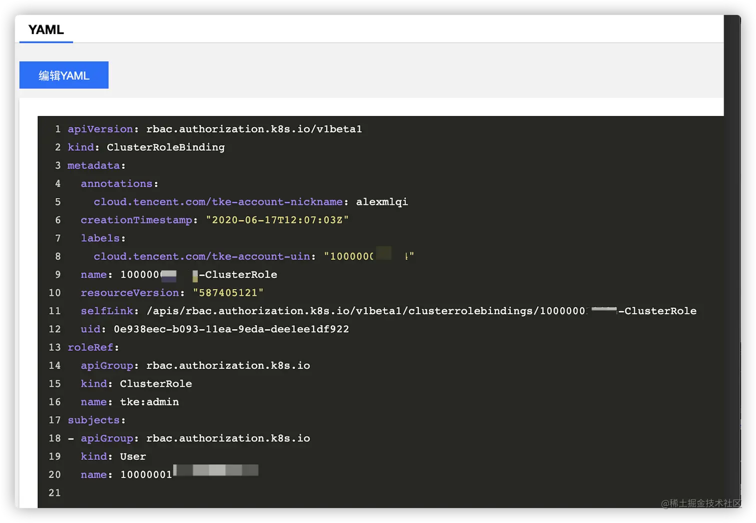 - 管理员(tke:admin):对所有命名空间下资源的读写权限, 对集群节点,存储卷,命名空间,配额的读写权限, 可子账号和权限的读写权限