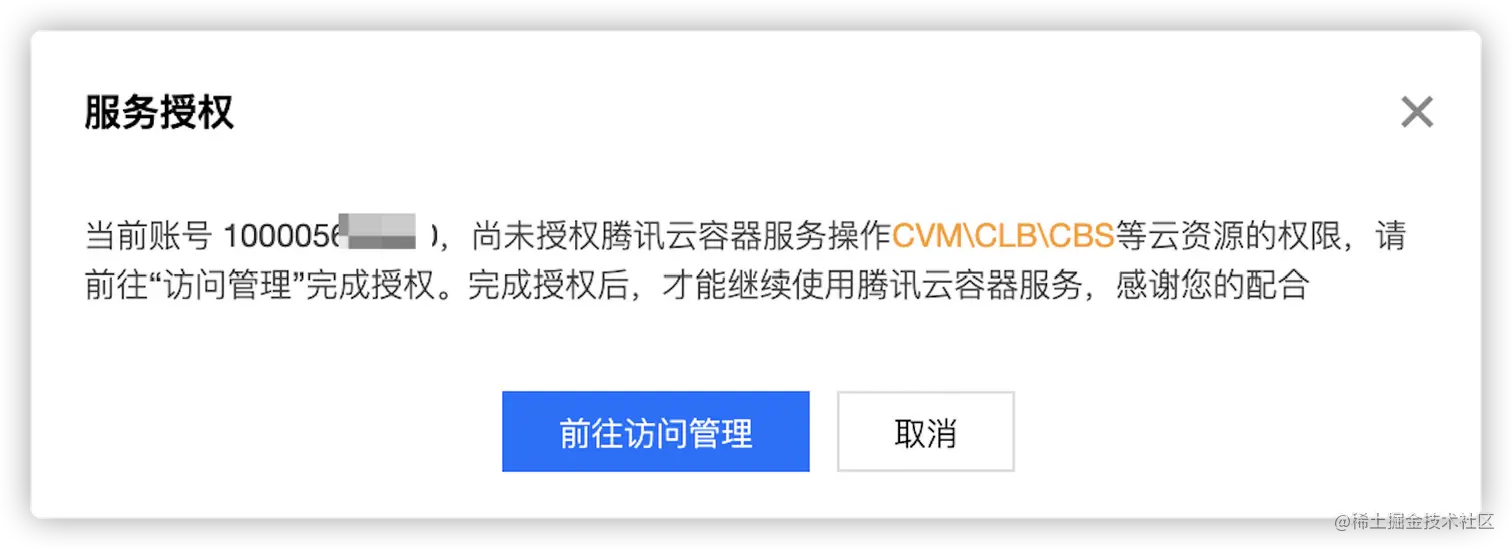 使用TKE容器服务需要授予TKE平台为您操作CVM\CLB\VPC\CBS等权限,所以首次访问TKE控制台需要确保同意授权,即创建预设角色TKE_QCSRole,此角色默认授予TKE载体,该载体会通过CAM获取操作您集群的临时密钥,来进行相应的云API操作。