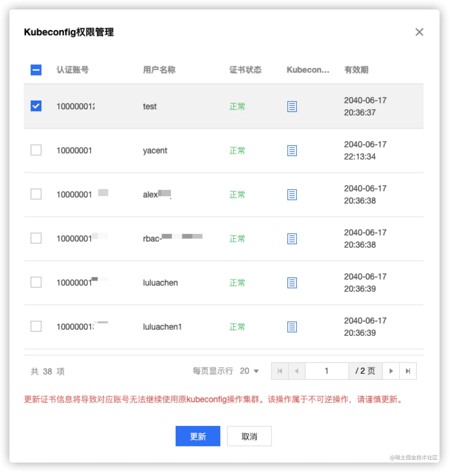 更新自己的证书。 - 支持主账户或集群tke:admin权限的账户进行