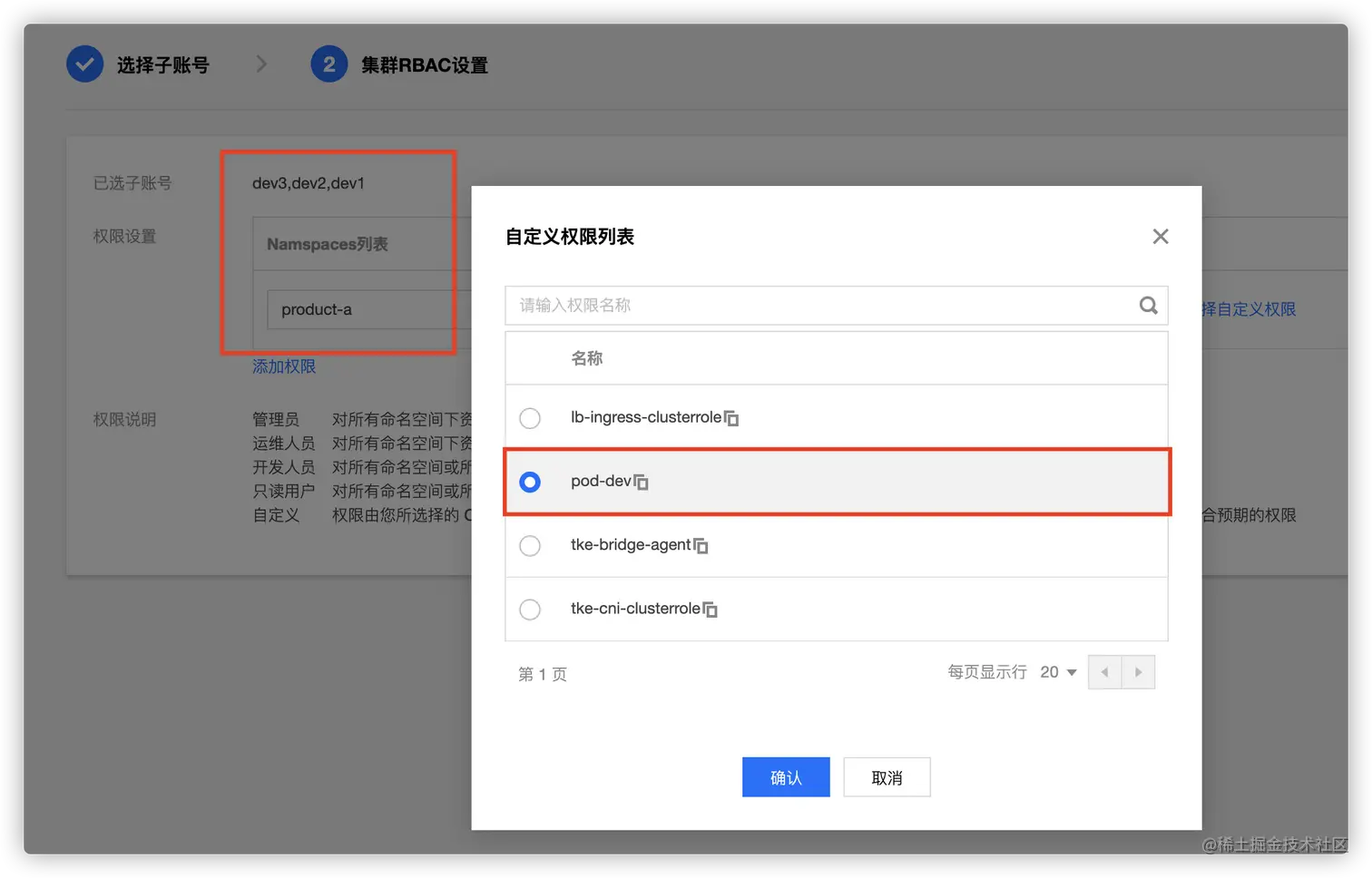 - 开发人员(tke:ns:dev): 对所选命名空间下控制台可见资源的读写权限, 需要选择指定命名空间。