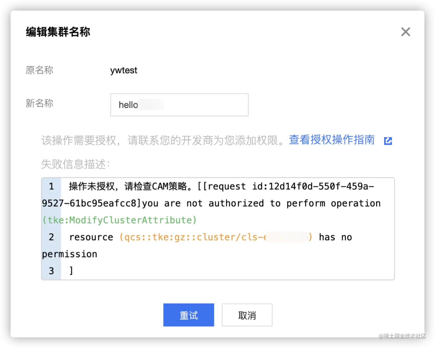 例如拥有只读权限的子账户尝试修改集群名称,将会在API接口时校验CAM权限失败